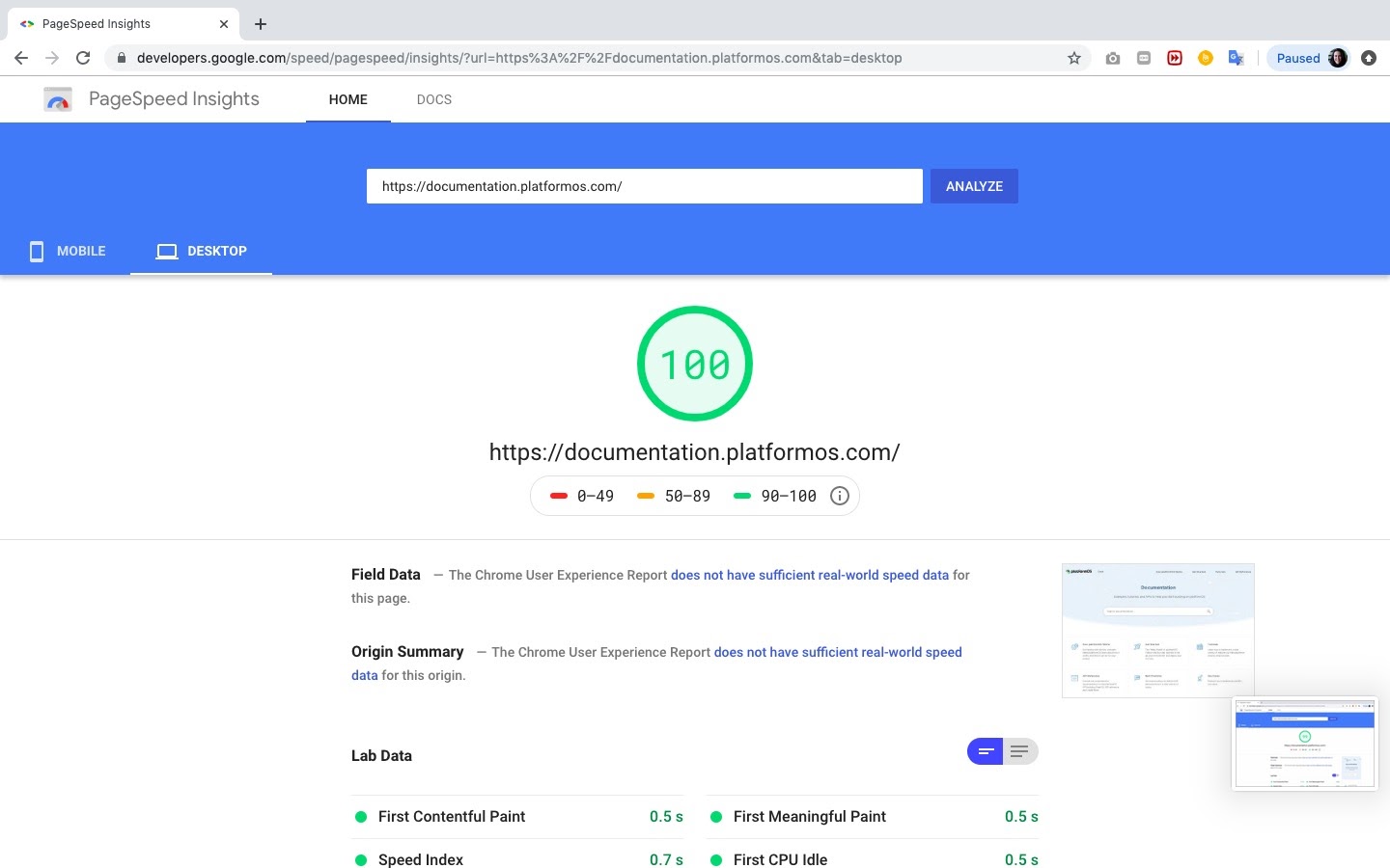 If you read our article about Code Quality and Performance Best Practices for Your platformOS Site, you know how good performance can help you keep visitors on your site, provide the best user experience, and rank high in search results. Our documentation is a high-performance site with a Google PageSpeed Insights score of 100 for both Mobile and Desktop, so we thought it could be helpful to dive a bit deeper into what tools we use and how we achieved this amazing performance.